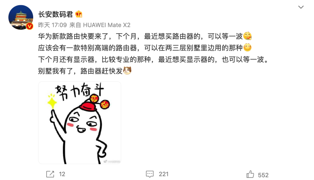 除此之外,华为爆料达人长安数码君还表示,下个月还有“特别高端”路由器和“比较专业”显示器发布。