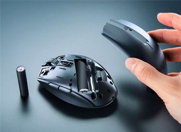 值得一提的是,八岐大蛇V2并不是一款内置锂电池的无线鼠标,而是采用混合式电池插槽设计,支持5号和7号电池。