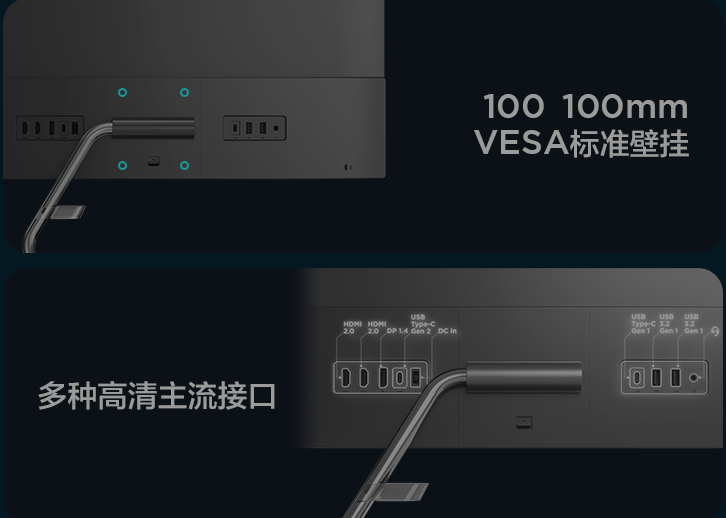 其他方面,这款显示器支持屏幕自发声技术,内置中低频和高频发声模块,底座是一个无线充电器,支持15W无线快充和Vesa标准。此外显示器的Typc-C接口最大支持96W输出。