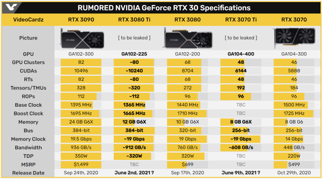 RTX 3070 Ti 将采用 GA104-400 GPU 核心,具有 6144 个流处理器、8GB GDDR6X 显存。