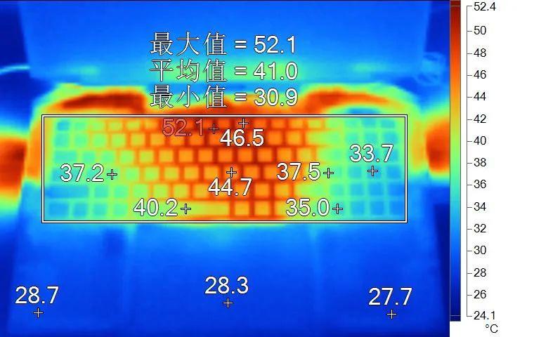 表面温度如上图所示,键盘键帽最高46.5℃出现在键盘中上部,WASD键附近约为37.2℃,方向键35℃。左腕托温度为28.7℃。