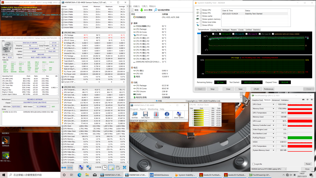在控制中心中把PL1和PL2都拉满(120W),单烤CPU,稳定在97W左右,温度95℃,比使用液金的X10Pro更低。