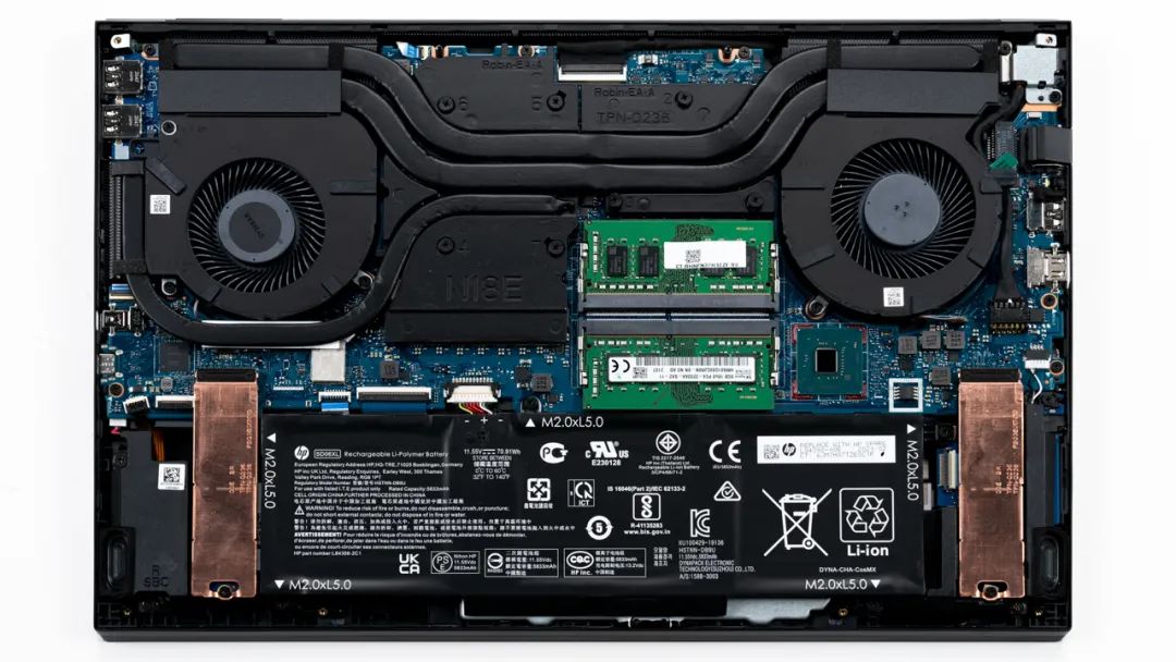 上图是机械革命 钛坦PLUS的拆机实拍图,5热管双风扇的组合。