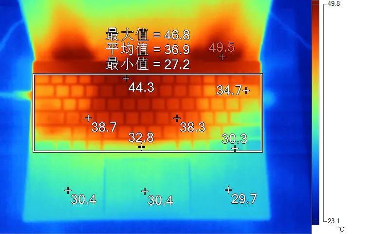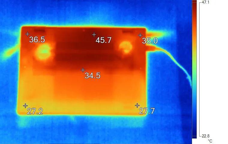 表面温度如上图所示,键盘键帽温度最高为44.3℃,WASD键位区域在38℃附近,方向键30.3℃。背面温度最高约45.7℃,中心点温度34.5℃。