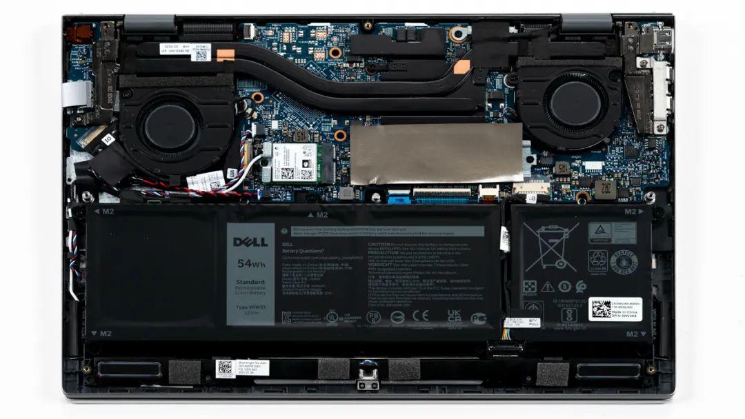 上图是戴尔 灵越13Pro的拆机实拍图,双热管双风扇的组合。主板上可以看到预留给独显的空焊位,这电脑单压CPU都费劲,非常不推荐考虑独显版。