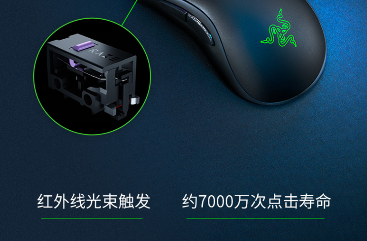 该鼠标的滚轮以及正面 Logo 均具有灯光效果,可以通过软件调节呼吸灯效。性能方面,鼠标搭载 20000dpi Focus+(PAW3399)光学传感器,与炼狱蝰蛇 V2 一致。具有 650ips 的追踪速度,保证了电竞性能。鼠标搭载雷蛇光电微动,具有高寿命、低延迟的特点。此外,产品上盖使用了 PBT 材质,提供了更好的手感。