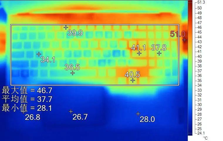 表面温度如上图所示,键盘键帽温度最高为41.1℃,WASD键位区域在34℃附近,方向键40.5℃。左腕托温度为26.8℃。