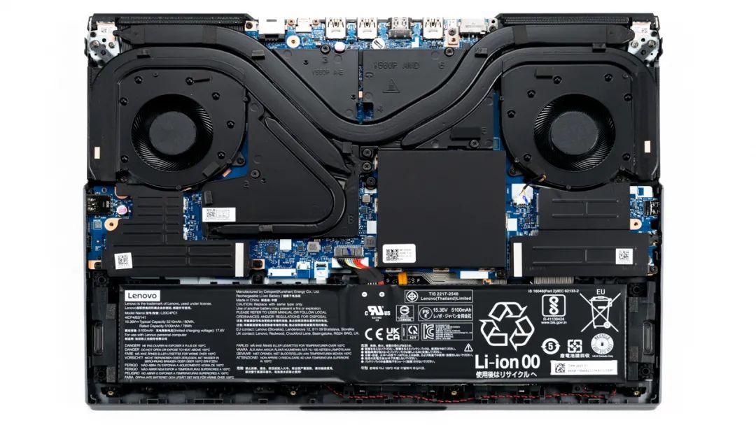 上图是联想 拯救者 R9000P的拆机实拍图,5热管双风扇的组合,其中一根热管隐藏在背面给显存散热,整个模组表面做了黑化处理。
