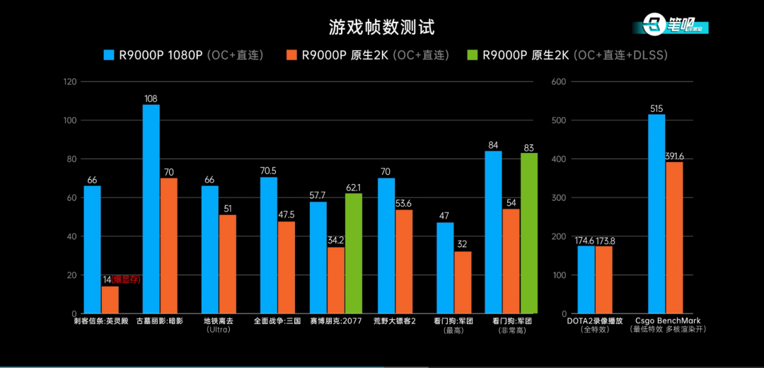 从上图可以看到,1080P下,多数大型游戏都可以超高特效60帧以上运行,但如果将分辨率开到2K,那就只有一款大型游戏能维持60帧以上了。