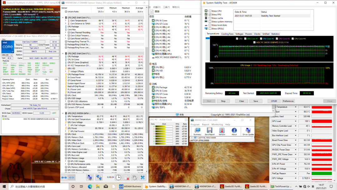 在满载状态下,CPU温度最高94℃,稳定在91℃,功耗42.7W,频率2.7GHz左右,有轻微过热降频。
