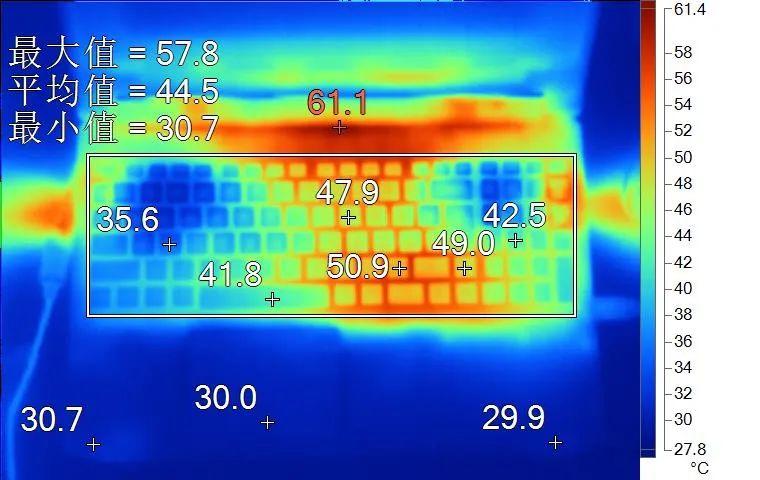 表面温度如上图所示,键盘键帽最高50.9℃出现在中下方,WASD键附近约为35.6℃,方向键49℃。左腕托温度为30.7℃。