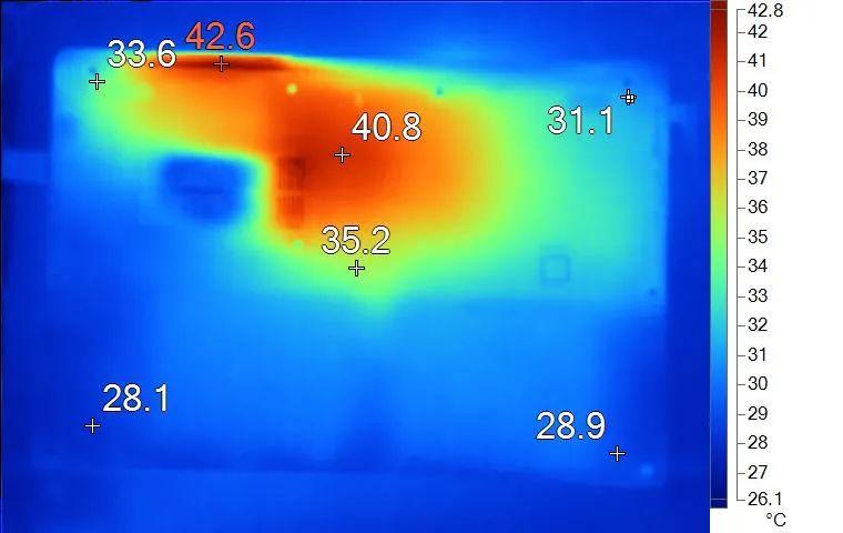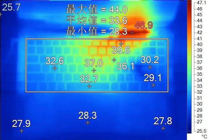 表面温度如上图所示,键盘键帽最高39.6℃出现在键盘F键区域,WASD键为32.6℃,方向键29.1℃。左腕托温度为27.9℃,背面中心点35.2℃。
