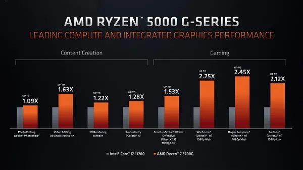 同时AMD也公布了锐龙7 5700G与隔壁酷睿i7-10700的性能比较,内容创作类场景如Photoshop、DaVinci Resolve等最高快了63%、在PCMark 10生产力测试中高了28%、计算性能高60%、游戏性能高53%-145%。