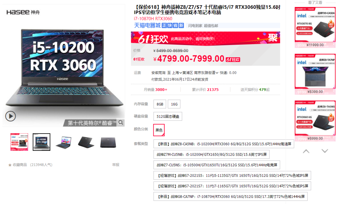 可以看到,游戏本从GTX1650显卡,到最新的RTX3060显卡都有。