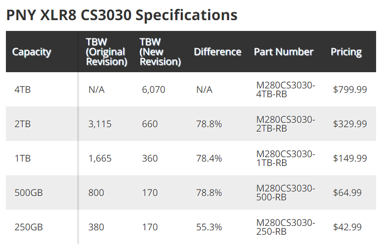 而就在日前,存储厂商 PNY也对自己产品的保修条款进行了更改,此次受到影响的为他们于19年推出的旗舰级产品XLR8 CS3030。PNY大幅下调了该系列固态硬盘的标称寿命,降幅在80%左右,并且同时表示,保修时将参考实际写入量。其中 1TB 型号由 1665TBW 降低至 360TBW。
