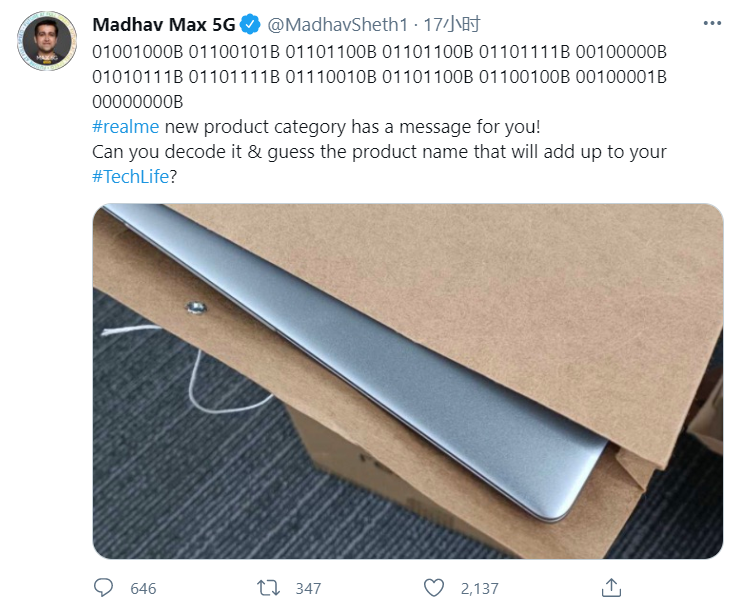 这一串二进制字符按照 ASCII 码翻译,表示的意思为“Hello World !”,网友们的猜测也很一致,就是 realme 首款笔记本。