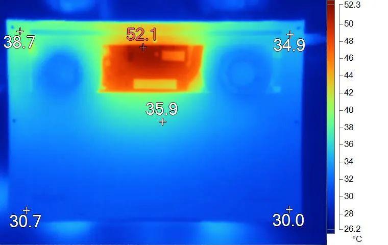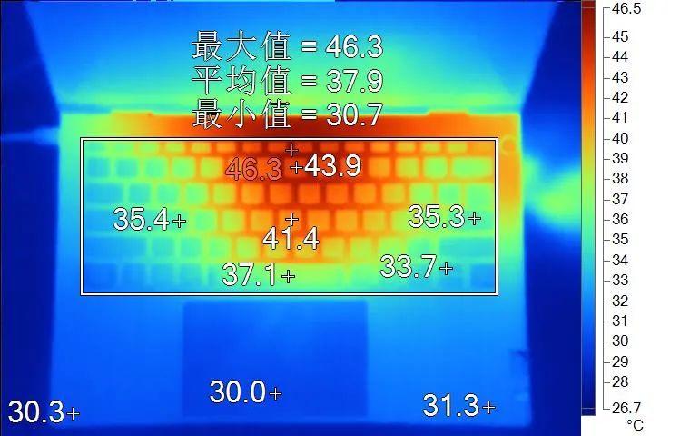 表面温度如上图所示,键盘键帽最高43.9℃出现在键盘中部,WASD键为35.4℃左右,方向键33.7℃。背面中心点35.9℃。