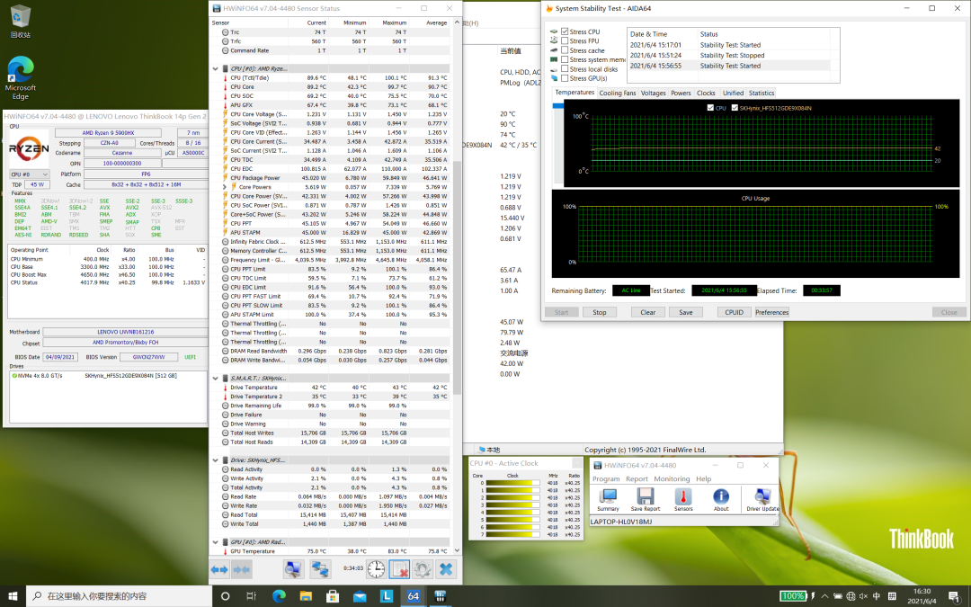 ThinkBook 14p最大的特点就是CPU,最高可以到R9 5900HX,这是AMD锐龙5000系列标压移动处理器中的旗舰款,烤机时可以稳定45W,处理器性能释放很强。
