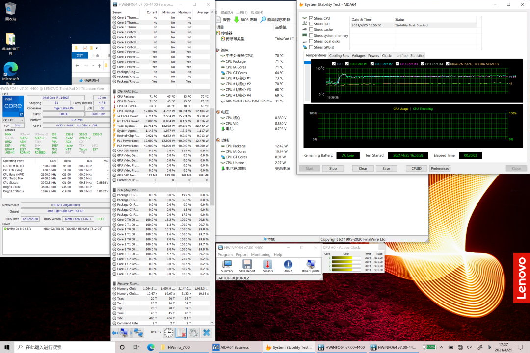 在平放状态下满载,CPU温度最高83℃,稳定在71℃,功耗12W,频率维持在3.1GHz。