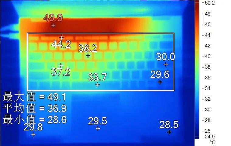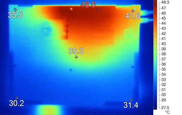 表面温度如上图所示,键盘键帽最高44.3℃出现在键盘F3键区域,WASD键为37.2℃,方向键29.6℃。左腕托温度为29.9℃,背面中心点39.3℃。