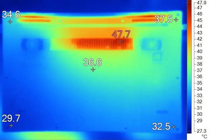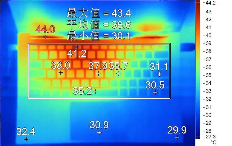 表面温度如上图所示,键盘键帽最高41.2℃出现在键盘F键区,WASD键为38.0℃,方向键30.5℃。背面中心点36.6℃。