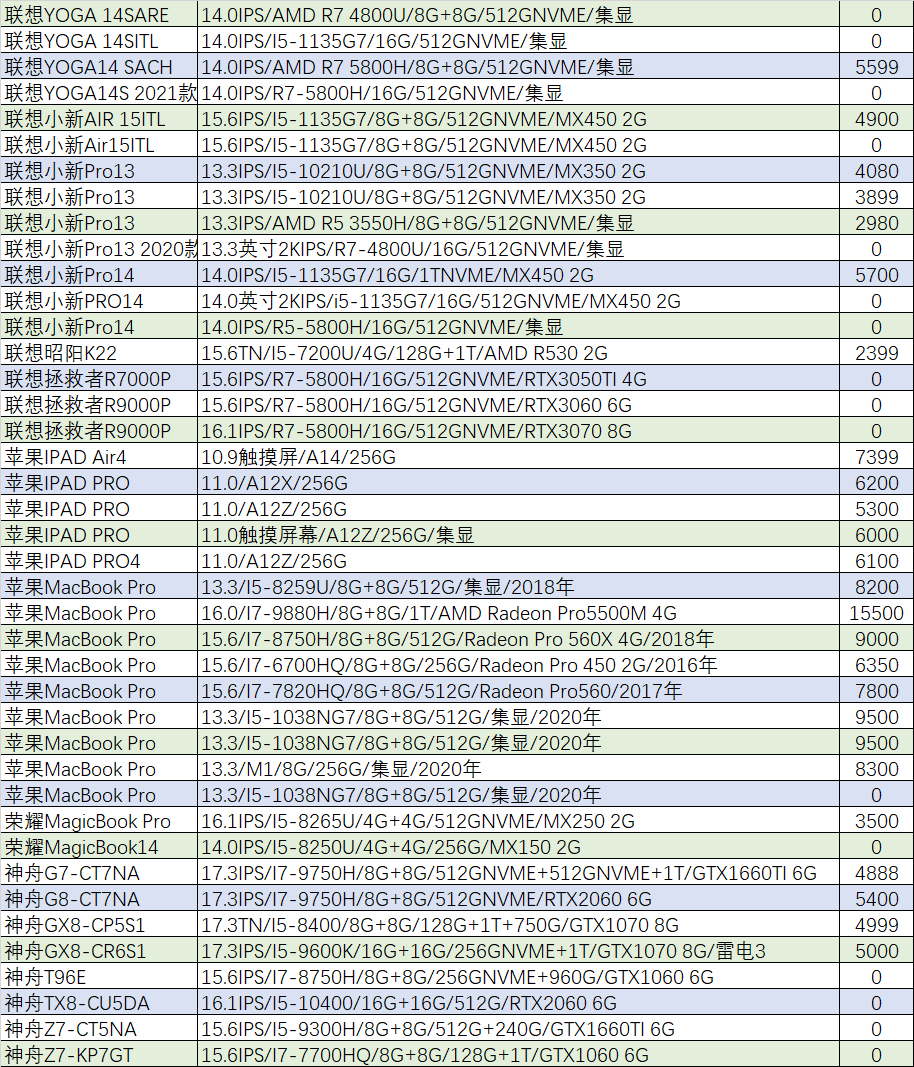 上周已售出机型:(无法列出成色,价格仅供参考)