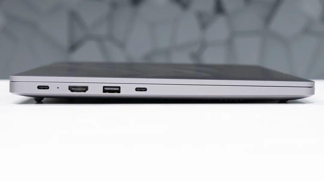 接口方面, 这台电脑有两个USB-A(右侧2.0,左侧3.1),两个USB-C(均为3.1速率,分别支持PD充电和DP视频输出),以及HDMI1.4和3.5mm耳麦接口,和Pro 15锐龙版完全一样。