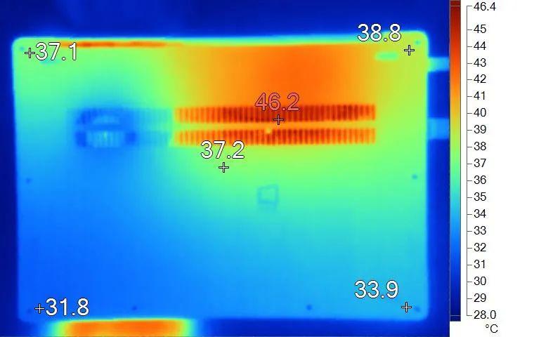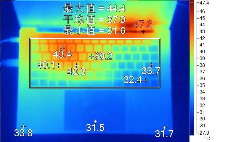 表面温度如上图所示,键盘键帽最高43.4℃出现在数字键区域,WASD键为40.1℃,方向键32.4℃。背面中心点37.2℃。