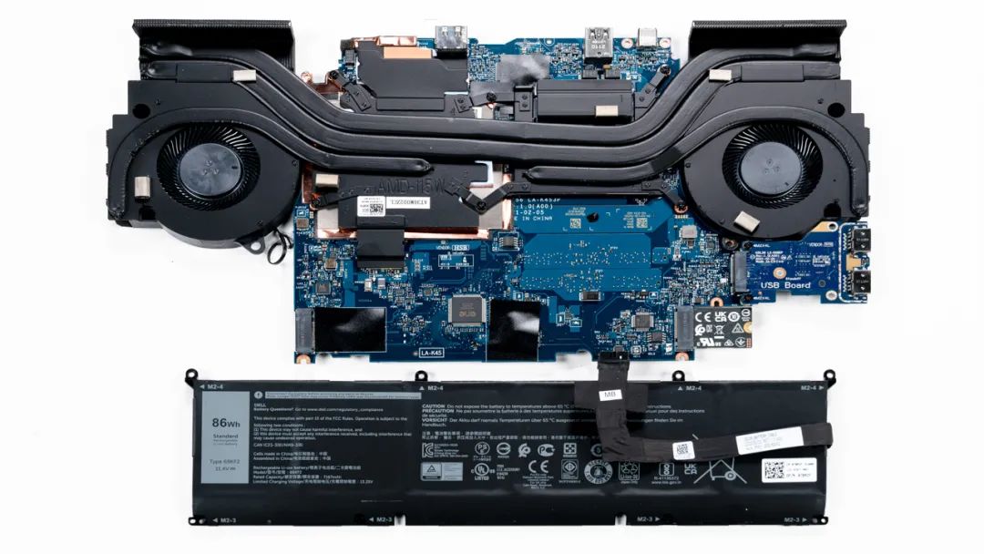 上图是戴尔 游匣 G15 锐龙版的拆机实拍图,4热管双风扇的组合,与之前测过的Intel版本相同。