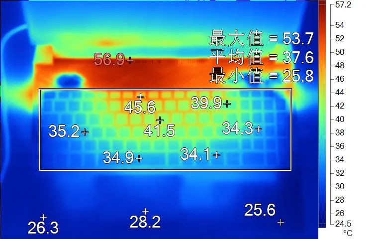 表面温度如上图所示,键盘键帽最高45.6℃出现在F键盘区域,WASD键附近约为35.2℃,方向键34.1℃。