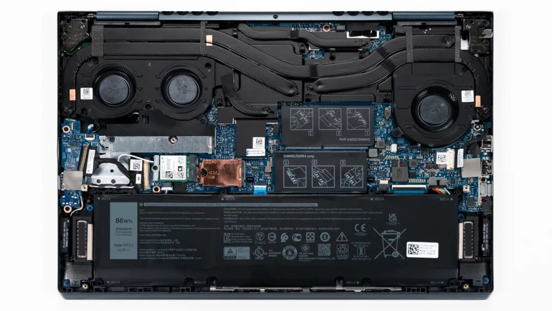 上图是戴尔 灵越16 Plus的拆机实拍图,5热管3风扇的组合,其中2根热管主要给供电和显存散热。注意低配版散热是3热管2风扇。