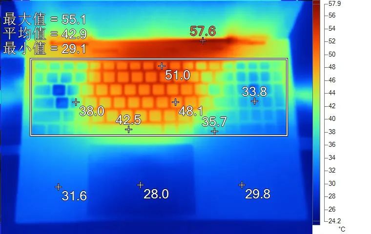 表面温度如上图所示,键盘键帽温度最高为51℃,WASD键位区域在38℃附近,方向键35.7℃。