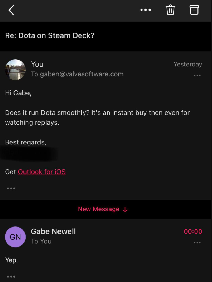 据国外 reddit 论坛,有网友给V社首席执行官 Gabe(玩家们称其为“G 胖”)发邮件,询问 Steam Deck 掌机能否运行《DOTA2》或者看比赛回放
