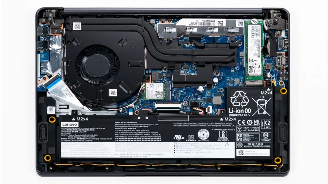 上图是联想 小新Air14 Plus的拆机实拍图,单风扇双热管的组合,和Air14大体一致,风扇罩子巨大无比,扇叶也有可见的提升。