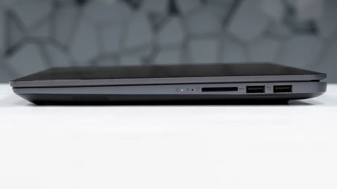 接口方面, 这台电脑有两个USB3.2 Gen1 Type-A接口,SD读卡器(USH-I),一个全功能USB-C,一个支持充电+传数据的USB-C,还有HDMI1.4、3.5mm音频接口。