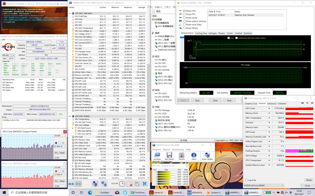 机器有三档性能调节,以下测试均在野兽模式下进行,使用负载较低的StressCPU+Furmark进行压力测试。