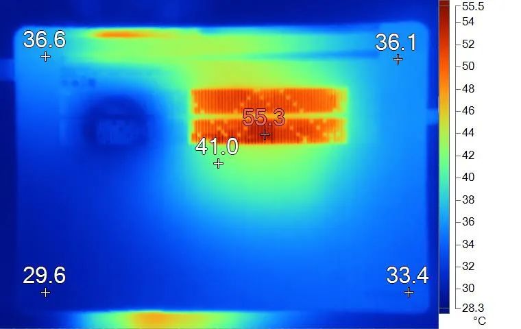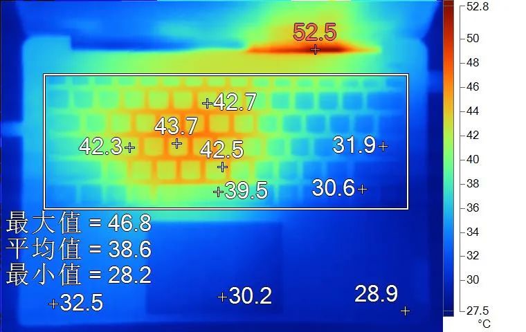 表面温度如上图所示,键盘键帽最高43.7℃出现在键盘中部偏左的区域,WASD键为42.3℃,方向键30.6℃。背面中心点41℃。