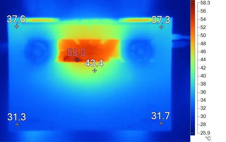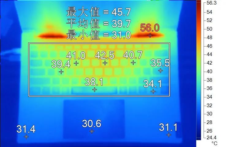 表面温度如上图所示,键盘键帽最高42.5℃出现在键盘中部,WASD键为39.4℃,方向键34.1℃。背面中心点43.4℃。