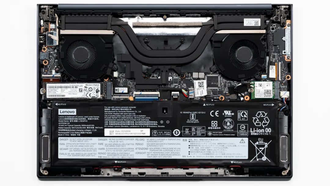上图是联想 YOGA 14s 标压新锐龙版的拆机实拍图,双风扇双热管的组合,散热规格和Intel酷睿版相同。
