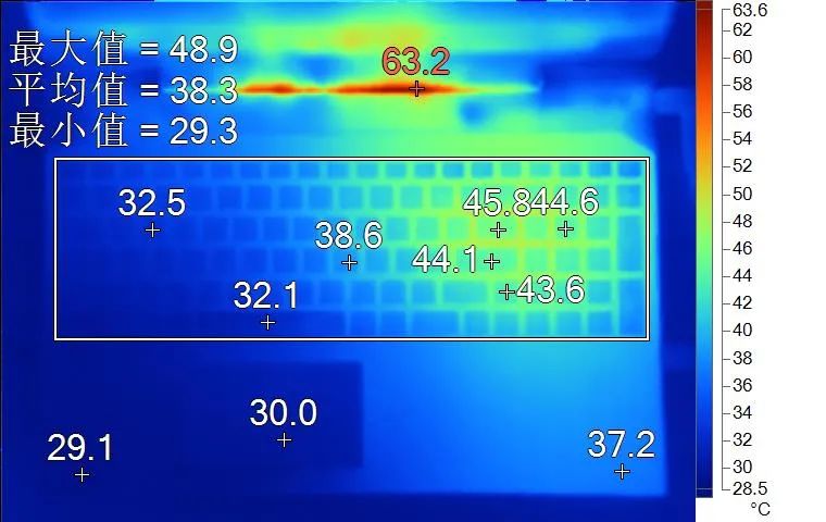 表面温度如上图所示,键盘键帽最高45.8℃出现在顿号键处,WASD键附近约为32.5℃,方向键43.6℃。左腕托温度为29.1℃。