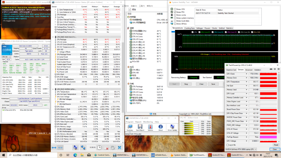 此时风扇转速默认会打到最大值,且CPU和显卡都触碰到了温度墙。