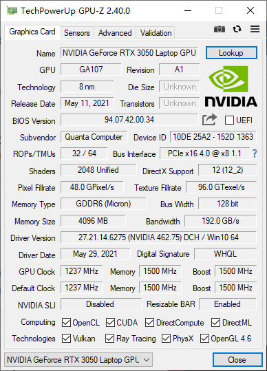 与GeForce RTX 3050Ti笔记本电脑GPU采用了同样的GA107核心,以及4GB GDDR6显存,流处理器2048个,相比RTX 3050Ti笔记本电脑GPU少了512个。