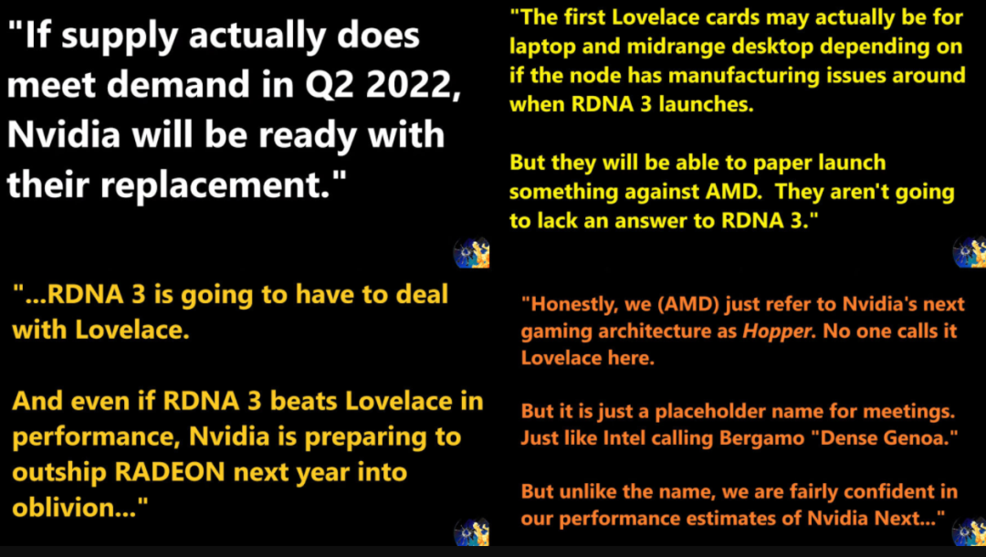 另一名爆料者 Moore’s Law is Dead 声称,代号“Lovela”不仅指桌面 GPU,还有可能包含汽车用芯片,属于 Orin 系列。他还表示英伟达试图通过降低生产成本,与 AMD RDNA 3 架构的显卡进行竞争。