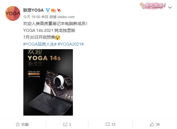 联想方面今日宣布,YOGA 14s 2021 锐龙独显版将于 7 月 30 日开启预售。