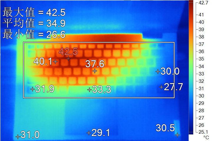 表面温度如上图所示,C面最高42.5°C在键盘左侧数字键边,键盘键帽最高40.1℃出现在键盘WASD键区域,方向键27.7℃。背面最高温度46.5℃,中心点36.1℃。