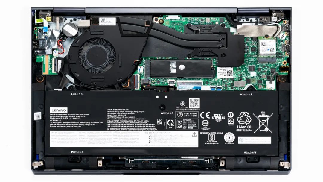 上图是联想 YOGA 14c 锐龙版的拆机实拍图,单风扇双热管的组合。