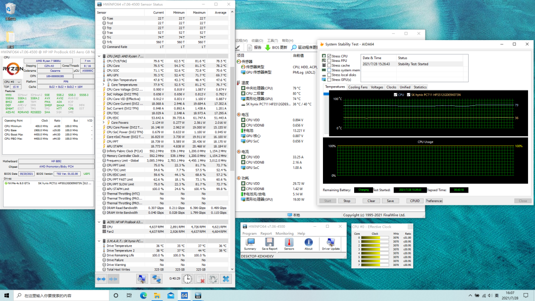 切换到性能模式,在满载状态下,CPU温度最高81.3℃,最终稳定在79.5℃,功耗16W,频率3.1Ghz。