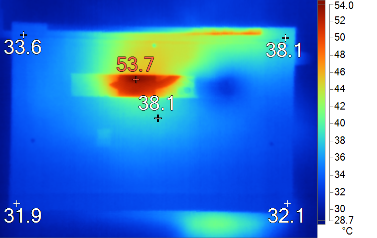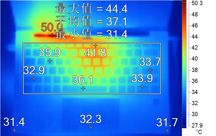 表面温度如上图所示,键盘键帽最高41.8°C在键盘中部上方的功能键上,WASD键区域温度为35.9℃,方向键33.9℃。背面最高温度53.7℃,中心点38.1℃。