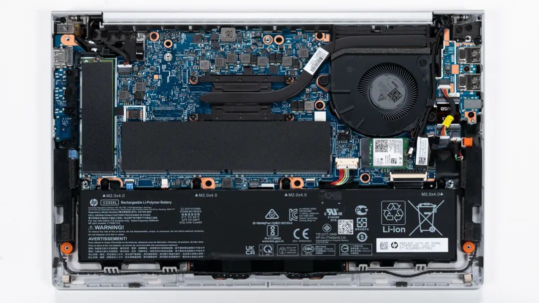 上图是惠普 ProBook 635 Aero G8-锐龙版的拆机实拍图,单风扇单热管的组合。