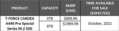 价格方面,十铨 T-FORCE CARDEA A440 Pro Special Series 固态硬盘 4TB 版售价 899.99 美元(约 5831.94 元人民币);8TB 容量版售价 1999.99 美元(约 12960 元人民币)。产品预计将于今年 10 月开售。